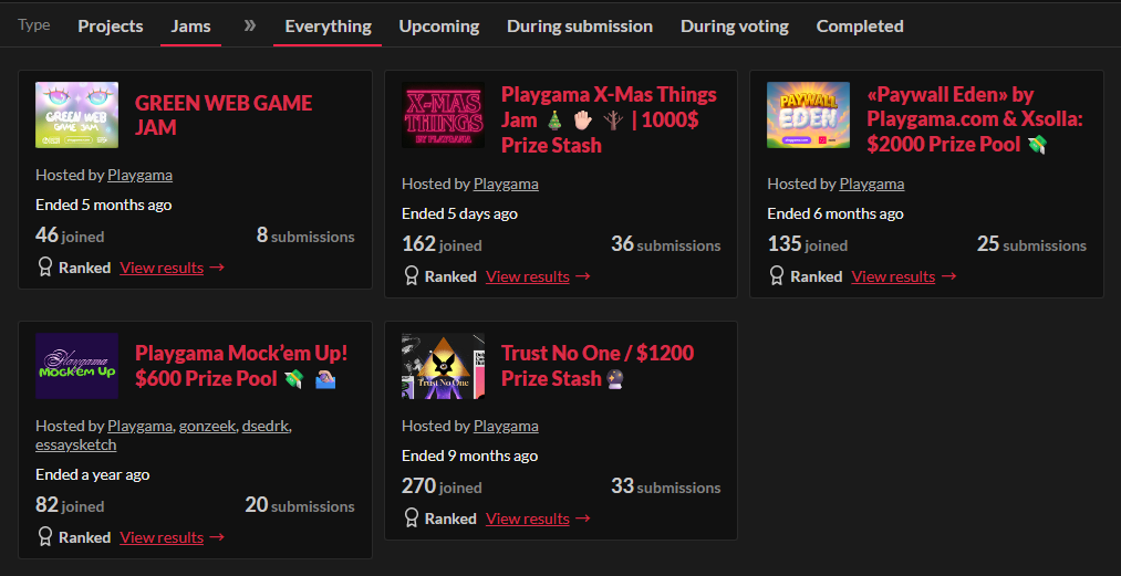 Playgama has hosted 4 game jams so far, and this X-Mas Things Jam is the fifth. Except for the Green Web Jam, all have offered rewards, and game jams with rewards had at least twice as many submissions.