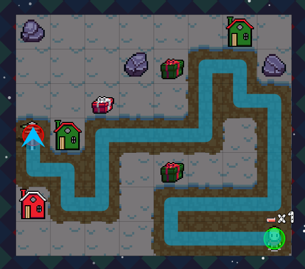 The gameās rules involve moving along a path to pick up presents and deliver them to houses that match each color. The presents are picked up in a cart that follows the character, and delivered from the cart. Presents are picked up when they are one space adjacent to the cart in any of the four directions, and delivered when the destination house hasnāt received a present yet and the cart contains the appropriate present. No more than two presents can be delivered to one house, and the cart cannot hold more than two presents at once.