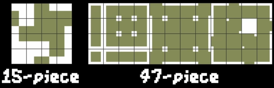 Another reason to use Dual Grid is that it uses fewer tiles. In a 2-corner tileset where each tileās corners are painted in one of two colors, while 47 tiles would be needed without using Dual Grid, it can be covered with just 15 tiles.
