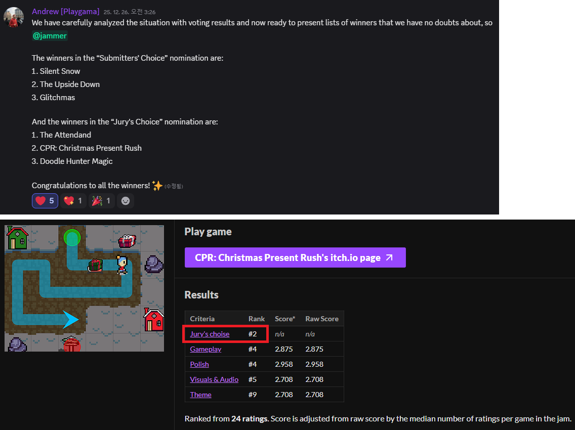 The area where I scored the lowest was the theme, and I thought perhaps others also noticed that I had a game I wanted to make and attached the theme later. I have some regret that it might have been better if I had strengthened the theme more, such as by lighting up houses when they received presents.
